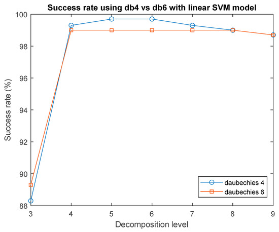 Another comparison between both mother wavelets is also proposed, which is to perform an energy analysis of the entire signal, that is, of all packets and using different decomposition levels. In this way, it will also be possible to determine the optimal decomposition level for the detection of these defects by considering the entire frequency range. To do this, a linear SVM model is used, since it is based on calculating the line that separates the different conditions (healthy, inner-race, and outer-race defects), which makes it easier to determine a threshold to set alarms. In Figure 7, the success rates of each mother wavelet and for different decomposition levels are shown.