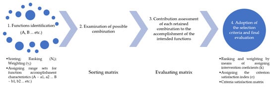 In a simplified approach, the procedure used in this study boils down to the 4 steps depicted in Figure 1. By following these steps, at the end of this process the election of the optimal solution in relation to the intended functions and the adopted criteria will be possible []. This involves predefining the key steps, objectives, and data needed to reach an optimal conclusion. Without solid planning, the analysis risks being disorganised, overlooking important factors, and leading to inconclusive results.