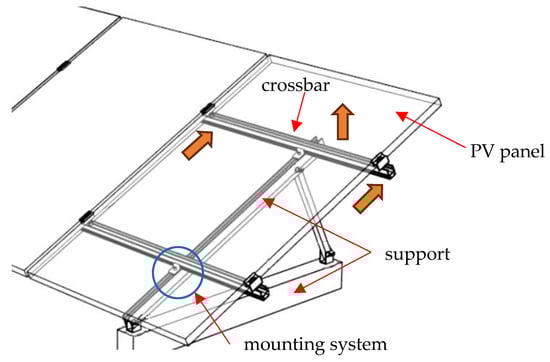 As shown in Figure 3, generally, two loadings occur on the crossbar, one in the upward direction and one along the PV panel. This involves two stresses on the hook element of the mounting structure, as is shown in Figure 5.