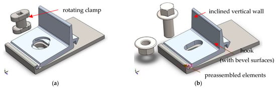 The preassembly option involves the use of a hinge type system, which favours the extrusion of the material in one direction, thus simplifying the manufacturing process and not just the exploitation process. After extruding the two elements, they must be further processed through the milling operation, obtaining either the cavity required for the rotating clamp, or the clearance required to insert the bolt.
