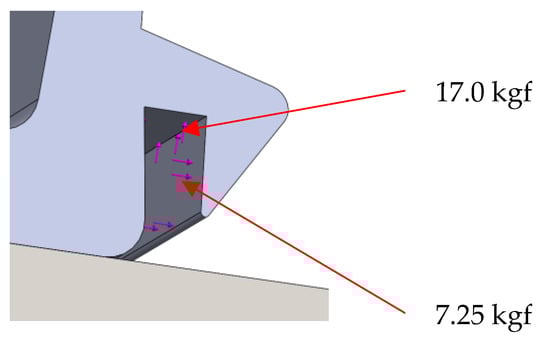 To obtain a resulting load of 20 kgf on the hook like profile of the upper component of the structure, a load of 7.25 kgf was assigned to the longitudinal direction and a value of 17 kgf was assigned to the upward direction. Both components of the structure were made of the same type of material (6061 AL alloy) and cast carbon steel was attributed to the rotating clamp. The bolt used in the other mounting structure type was made from standard alloy steel.