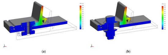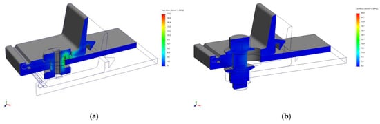 The maximum von Mises equivalent stresses do not occur on the loaded area but on the clamping area between the two components and the rotating clamp or bolt, respectively. The values are quite different but fall within the admissible yielding limits for the materials from which the components are made. A graphical representation of these data can be found in Figure 6.