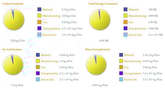 - Total energy consumed—A measure of the non-renewable energy sources associated with the component’s life cycle in units of megajoules (MJ). This impact includes not only the electricity and fuels used during the product’s life cycle but also the upstream energy required to obtain and process these fuels and the embodied energy of materials which would be released if burned.