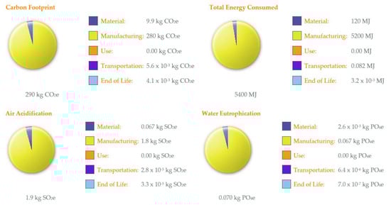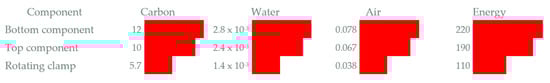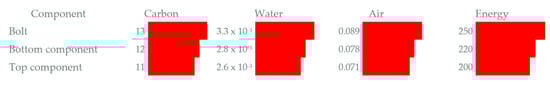 SolidWorks Sustainability is an add-in that allows the assessment of the environmental impact of designs during the early stages of development. As mentioned previously, this assessment is based on CML methodology, which considers the input data shown in Table 7. After running the program for the a1b2c2d2-type structure, the results presented in Figure 10 were obtained. Consequently, the components of this structure contributing most to the four areas of environmental impact are plotted in Figure 11.