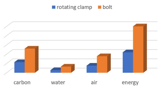 In all four assessed criteria, the a1b2c2d2-type structure is at an advantage because it benefits from much lower material consumption compared to the other structure. If the a1b2c2d2-type structure weighs 101.38 g, the other one weighs 22.8% more, i.e., 124.52 g. This difference, as well as the volume of the fastening element, makes the a2b2c2d2-type structure less desirable from this point of view. The characteristic indices for each component show that the bolt used in the assembly is more damaging compared to the rotary clamp, a fact shown in Figure 14.