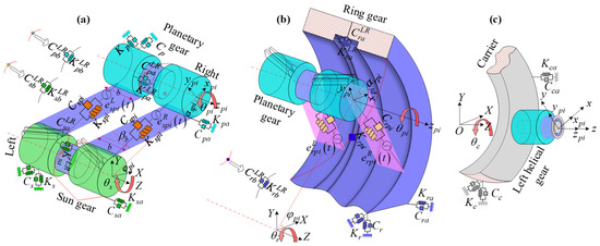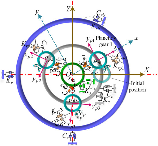Figure 3c shows the dynamic model of the carrier and planetary gear. In this section, L and R are not used because of the same parameters. The motion equations of the carrier and planetary gears can be deduced as follows: