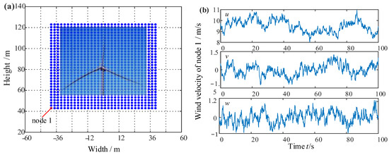 Based on the above theory and the sizes of the tower and blades, the sweep plane of the impeller was divided into 32 × 32 (1024) nodes to describe the turbulent wind velocity, as shown in Figure 6a,b. The horizontal coordinate represents the width of space and the vertical coordinate represents the height of space. The size parameters of the wind turbine are shown in Table 1. At 3 s, 6 s, and 9 s, the turbulent wind conditions are shown in Figure 7.