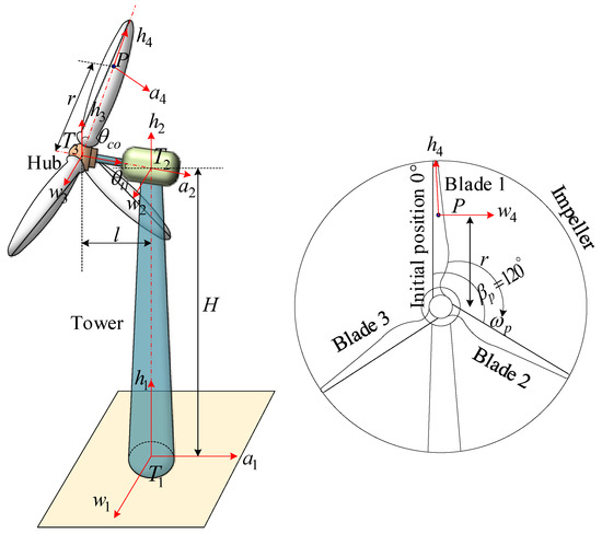 Before starting with the calculation of the aerodynamic load, the four coordinate systems were defined to display the blade element’s position as shown in Figure 8, and the construction of the coordinate systems could begin with the observation point P of the rotational wind blade 1. The coordinate system is connected to the ground and is a fixed system. The original point is set at the base of the tower. , , and represent the tower top position, hub position, and blade element position, respectively. Two inclination angles exist in the plane ( and ), but they are all set to zero for this calculated load task. The position angle, , between the three blades is 120 degrees. stands for the angular velocity of the impeller.