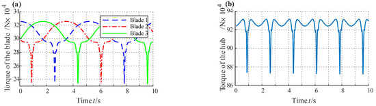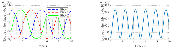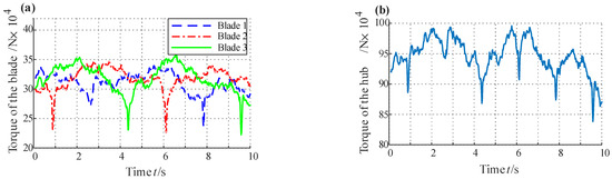 To calculate the torques acting on the entire blade, it is only necessary to integrate the torque elements spanwise across the blade, as shown in Figure 9, Figure 10 and Figure 11. The inflow velocity of the hub is steady in the results from Figure 9 and Figure 10. The torque of the different blades can be seen in Figure 9a, and the torque variation is mainly affected by the wind shear effect. The torque presents periodic fluctuations. Combined with Figure 5, the value of is at its minimum when the blades rotate to 180 degrees. The blade alternating fluctuation is due to the position angle difference between the blades of 120 degrees.