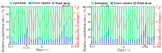 In Figure 16a, the relative contribution rate ranges of the wind shear, tower shadow, and turbulent are [0.91%, 23.61%], [1.31%, 28.44%], and [47.94%, 93.88%]. It is not difficult to find the law of the contribution rates of the wind shear and tower shadow. The excitation load enters the shadow effect center at t = 11.32 s and t = 13.06 s. When the load excitation enters the region of the tower shadow, their values increase gradually, whereas the load excitation exits the region of the tower shadow, and their values decrease. In particular, the contribution rate of the tower shadow quickly climbed to 28.44%. This is because the tower shadow causes the load excitation to quickly fall. When the blades are not in the region of the tower shadow, the contribution rate of the wind shear and tower is low (mean ≤ 7%). This means that the effect of the wind shear and tower shadow can be ignored at this stage.