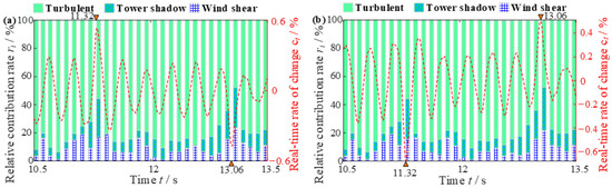 The relative contribution rate of each influence factor is shown in Figure 16 and Figure 17. The relative contribution rate of the turbulent was maintained at the highest level. Strikingly, the mean values of in Figure 16a,b and Figure 17a,b are 80.368%, 80.372%, 80.371%, and 80.370%, respectively. Regarding the tower shadow effect, they are 10.314%, 10.312%, 10.312%, and 10.313%. The contribution rate of the wind shear effect were calculated to be 9.318%, 9.316%, 9.317%, and 9.317%. These can describe the whole variation of the relative contribution rate. However, the time-varying properties cannot be reflected.