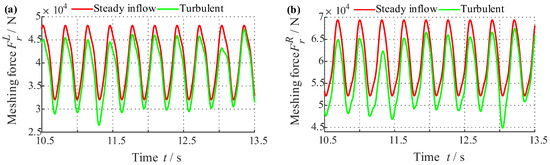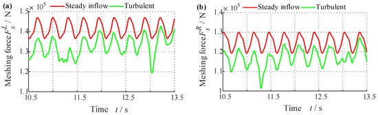 To analyze the dynamic characteristics in the herringbone planetary gear system, the different wind conditions, including the steady inflow (VH = 11 m/s) and turbulent wind, were considered in the motion equations. After solving, the meshing forces, displacements, and centroid trajectories could be obtained. Their description and analysis are shown as follows. In addition, the turbulent wind in this section stands for a wind condition including the wind shear, tower shadow, and turbulent effect.
