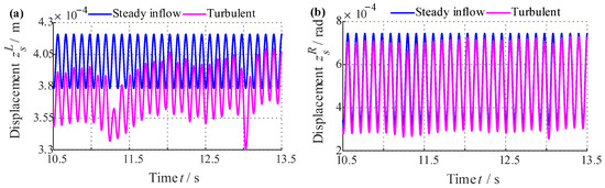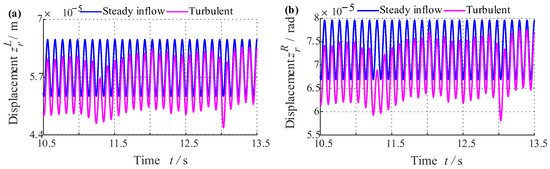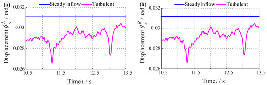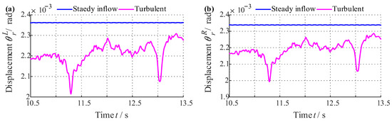 As can be seen in Figure 20 and Figure 21, the torsional displacements of the ring gear are more obviously influenced by the turbulent wind condition than the axial displacements. This is because the axial excitation is ignored after considering the herringbone gear special structure and the bearing support design of this wind turbine. Therefore, the fluctuations in the axial displacements are generated by the axial–torsion coupling term in the motion equations. This greatly weakens the influence of the turbulent wind condition on the axial vibration in the transmission system. Meanwhile, this means that the axial displacements of the ring gear are slightly affected by the torsional excitation under turbulent wind conditions. In the design of the ring gear, the fluctuation in the torsional excitation can be ignored.