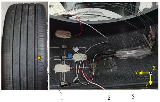 In order to accurately extract the in-tire acceleration signals to study the sidewall characteristics of the tires, a triaxial accelerometer (DYTRAN 333MT, range ±500 g) was arranged at the inner tire side near the outside of the vehicle, as illustrated in Figure 1. The sensor signal was transmitted in a wired manner. In Figure 1, the Z-axis of the accelerometer is perpendicular to the tire surface and points to the wheel axis. The X-axis is in the longitudinal direction of the tire and points in the opposite direction to the output end of the accelerometer signal. The Y-axis is the lateral direction of the tires, the pointing of which is determined by the right-hand rule, and the positive direction of the Y-axis points to the outside of the vehicle. The lateral acceleration of the accelerometer at the rightmost position is denoted as Ay3. It is noteworthy that the accelerometer is arranged in a symmetrical position on the far left, and the effect is the same as that on the far right.