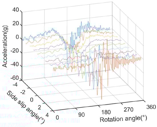 Figure 3 demonstrates the relationship between the lateral acceleration Ay3 time-domain waveform and the side-slip angle in the side deflection test under a tire pressure of 2.5 bar, a vertical load of 4000 N, and a vehicle speed of 60 km/h. The lateral acceleration adopted a low-pass filter with a cutoff frequency of 400 Hz. It can be seen from Figure 3 that the signal amplitude of Ay3 was significantly correlated with the tire side-slip angle. When the side-slip angle was −4°, the Ay3 waveform exhibited a downward-facing peak. As the side-slip angle increased to 4°, this wave peak gradually turned into two downward wave peaks, and the absolute peak value gradually increased. This is mainly because the tire side deflection direction is opposite to the accelerometer sticking position. When the tire slip direction is consistent with the acceleration sensor pasting position, the lateral force in the tire contact patch increases with the slip angle, which is represented by a gradual increase in lateral acceleration. Additionally, when the side-slip angle was ±4°, the lateral acceleration of the tire during the ground-breaking process was significantly larger than the acceleration fluctuation during the tire-grounding process. This was mainly due to tire slip, i.e., tire slip starts from the ground-breaking process and gradually extends to the entire contact patch as the side-slip angle increases []. During a complete single rotation of a tire, the middle of the range of rotation angles from 90° to 270° includes the process of grounding and lifting the tire off the ground.
