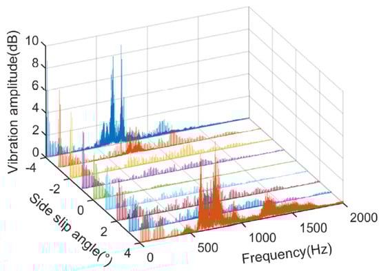 The influence of the side-slip angle on unfiltered lateral acceleration Ay3 was analyzed from the perspective of the frequency domain. It can be seen from Figure 4 that, within the frequency domain of 400 Hz, as the side-slip angle increased from −4° to 4°, the signal vibration amplitude gradually decreased, and multiple peaks appeared. The results indicated that when the tire deviated to the right side, the right sidewall gradually produced high-frequency vibration. Meanwhile, when the side-slip angle increased, there was a significant increase in the vibration amplitude of 500–1000 Hz, indicating that the side-slip angle affected the Ay3 at 500–1000 Hz. Moreover, when the side-slip angle was 4°, a total of three peaks appeared in the frequency domain of 400 Hz, with frequencies around 43 Hz, 180 Hz, and 342 Hz, respectively, corresponding to multiple downward-facing peaks in the time domain waveform of the tire grounding process. It is noteworthy that when the side-slip angle was 4°, the lateral acceleration also peaked near 1274 Hz, and this was mainly related to the slippage of the tire tread.