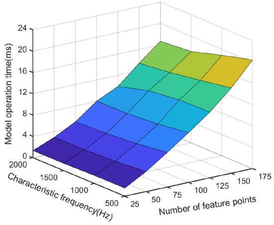 As shown in Figure 11, the number of feature points had a significant impact on the model’s calculation time, while the feature frequency band had a smaller impact. Meanwhile, as the number of feature points decreased, the model’s operation time was reduced. For example, when the number of feature points was 175 and the characteristic frequency band was 500 Hz, the model’s operation time was 20.402 ms. When the number of feature points was reduced to 25, the model’s operation time was reduced to 1.5394 ms.