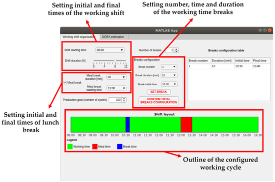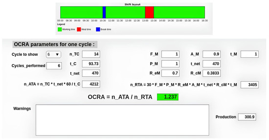 The SaRAH app interface features two main tabs. In the first tab (Figure 3), it is possible to configure the working shift, setting the overall duration and break times, as well as the desired number of cycles per working shift. These factors directly affect the OCRA index calculation, in particular the terms categorized as task frequency and characteristic information.