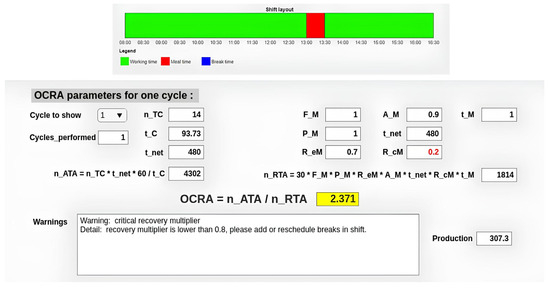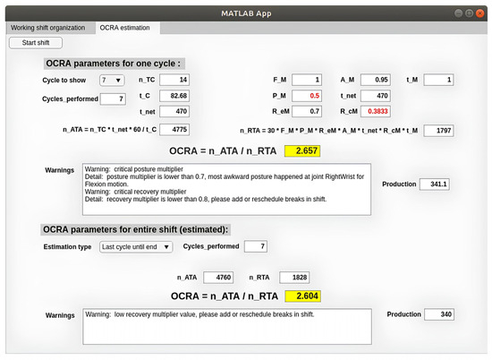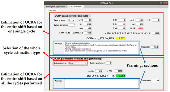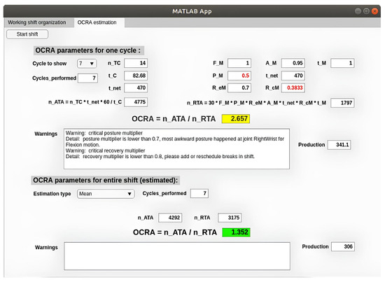 The second tab (Figure 4) shows the results of the OCRA index computation, which is updated in the online mode at the end of each working cycle. The upper part of the tab reports the results of each single cycle, which can be selected by the drop-down menu (by default the last performed is selected). The OCRA index displayed is forecasted considering the selected working cycle repeated over the whole shift. In the online mode, the value provides information about the performance of a specific cycle, whereas in the offline mode it can be directly considered to reshape, if necessary, the working shift (e.g., adding more breaks) to improve the calculated OCRA index by returning to the previous tab. A warning section indicates if any multiplier is becoming critical; in case of high values of the posture or force multiplier, the limb mostly affected is also indicated. In the lower part, the OCRA index estimated for the entire shift considering also the previous cycles is reported. Two different estimations can be obtained: “Mean”, based on the average of the recorded cycles, and “Last cycle until end”, which is instead based on the assumption that the performance of all the upcoming cycles will be the same as the last cycle in order to predict the necessity of any modification to the execution of the task.