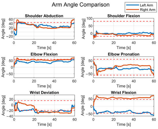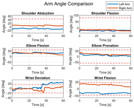 Angles of the upper limbs for a working cycle in which the posture is problematic (the red dashed lines indicate the limit angles).