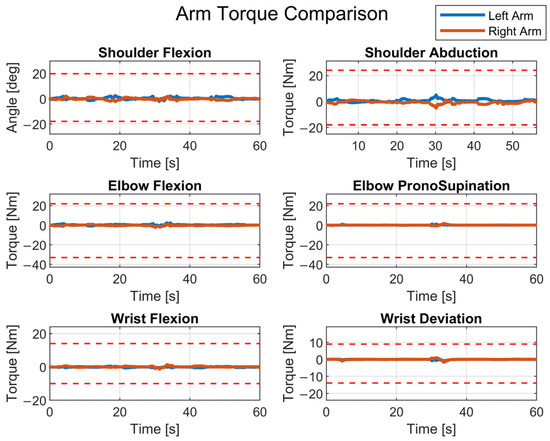 Torques of the upper limbs for an ergonomically non-problematic working cycle (the red dashed lines indicate the limit torques).