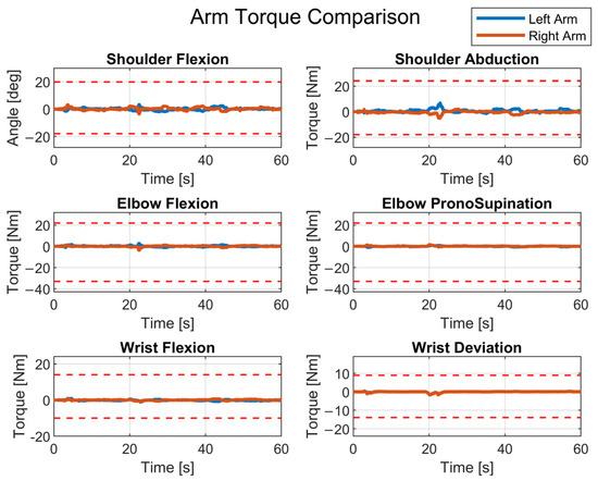 Torques of the upper limbs for a working cycle in which the posture is problematic (the red dashed lines indicate the limit torques).