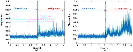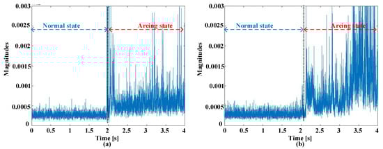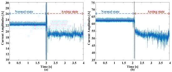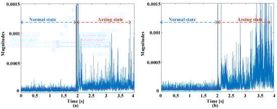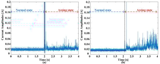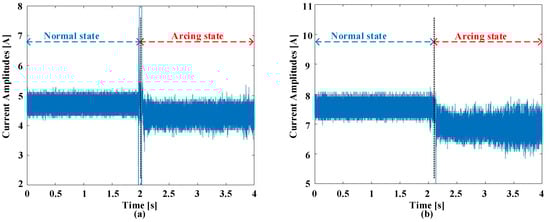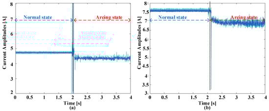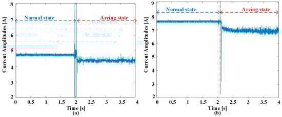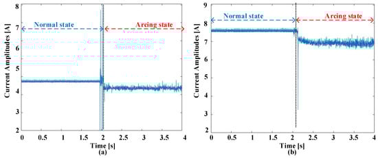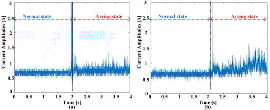 Figure 2 offers a visual representation elucidating the waveforms observed in the time domains, showcasing instances of ordinary working and the inception of failure experiences at switching frequencies of 5 kHz. These observations encompass two scenarios, one with a current amplitude of 5 A and another with an amplitude of 8 A. Prior to the initiation of arcing, there is a discernible uniformity in waveform characteristics across various current amplitudes and switching frequencies. Nonetheless, the establishment of an electric failure into the circuit injects a myriad of abnormalities into these signals. These anomalies entail an increased prevalence of harmonic components overlaid on the load current, a deformation leading to distorting characteristics, and a slight reduction in the amount of the existing current. The initial phase of the failure incident is conspicuously characterized by prominent spikes in amplitude. These spikes are a straightforward effect of the heated leak of electrical flashes. It is imperative to underscore that the exposed and uncharacteristic occurrences sustain meaningful promise as distinctive pointers within the realm of arc fault detection. Indeed, the behavior of the current during arcing events can exhibit variations that may not align with conventional expectations. In this study, the authors have observed that while there is a general trend of current reduction during the onset of arcing, there are also instances where large fluctuations occur at the beginning of the fault event. These fluctuations are often characterized by sudden spikes in amplitude and may not follow a regular cycling pattern. These abrupt fluctuations in current amplitude can be attributed to the dynamic nature of arc discharge. When an electrical arc is initiated, there is a rapid and chaotic exchange of energy between the electrodes, resulting in the formation of fiery sparks and the generation of high-frequency harmonics. These transient phenomena manifest as sharp peaks in the current waveform, indicating the presence of arcing activity. It is important to note that the behavior of the current during arcing events can vary depending on other factors, such as the severity of the fault, the characteristics of the arc, and the surrounding circuit conditions. While a reduction in current may be observed as the fault progresses, the initial stages of the arcing event are often characterized by these erratic fluctuations and transient spikes in amplitude. Therefore, in Figure 2, the observed reduction in current during arcing is accompanied by the presence of conspicuous spikes and abnormalities in the waveform, highlighting the complex nature of arc fault phenomena.