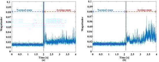 Conversely, a completely distinct pattern materializes following the initiation of the arc event. This pattern is marked by the noticeable emergence of a multitude of distortions prominently evident inside the spectrum covering a specified range (3–30 kHz). These complex interactions within the frequency spectrum provide valuable insights into the distinctive characteristics of both switching noise and arc-induced distortions, enhancing our understanding of the underlying phenomena.