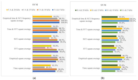 The diagnosis rates of SVM under various current scales and switching rates. (a) 5 A load. (b) 8 A load.