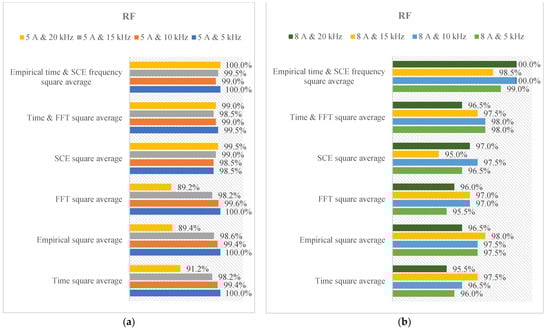 The depiction in Figure 16 showcases the efficacy of arc fault diagnosis in a three-phase inverter across different operational parameters. These outcomes are derived from the SVM algorithm. A noteworthy observation is the superior accuracy achieved with the square average underscoring the efficacy of the filtering process in amplifying the visibility of arc distortions. Moreover, combining square averages in both domains yields a substantial upgrade in the precision of diagnosis when compared to using either the empirical or SCE square averages alone. This enhancement is particularly prominent across all switching rates, signifying the efficiency of this approach in enhancing diagnostic accuracy. It is important to emphasize that, in certain cases, the accuracy achieved by combining the time domain signal square average and FFT square average is similar to the proposed method. However, it should be noted that the proposed approach significantly improves the overall diagnostic accuracy, offering a more robust and effective solution for arc fault detection. This enhanced accuracy is specifically distinct for a current of 8 A, showcasing the robustness and efficiency of this technique across different scenarios. In Figure 17, the authors present a comprehensive analysis of the fault diagnosis performance for an inverter system, investigating a range of operational conditions encompassing various current scales (5 A and 8 A) and various switching rates. This in-depth analysis involves the utilization of an integrated methodology that combines filtering techniques and the RF model. The results of this analysis shed light on the system’s effectiveness in detecting and diagnosing arc faults under diverse scenarios. It is particularly striking to observe that the accuracy of the signal square average consistently outperforms that of the raw signal square average. By preprocessing the data, we effectively amplify the diagnostic potential of the signal, resulting in more pronounced and discernible fault signatures. Furthermore, a significant breakthrough emerges when we combine square averages that have undergone a preprocessing operation.