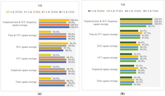 Moreover, a pivotal advancement materializes when we amalgamate square averages that have undergone preprocessing with both empirical filtering and SCE. This hybrid approach markedly bolsters the precision of arcing diagnosis. In direct comparison to the utilization of either the empirical or SCE square average in isolation, the combined approach consistently excels across the entire spectrum of switching frequencies. This outcome reaffirms the intrinsic value of the filtering process and accentuates the complementarity of SCE in terms of enhancing diagnostic accuracy, considering the signal’s complexity. This improvement is particularly evident in scenarios involving higher current amplitudes, such as 8 A. This underscores the robustness and efficiency of this method in diagnosing arcing failures across diverse operational settings, establishing it as the preferred choice for enhancing diagnostic precision. In Figure 19, we present a meticulous and all-encompassing examination of the performance of an arc fault diagnosis system implemented within the context of a three-phase inverter configuration. This comprehensive investigation spans a gamut of operational scenarios, including varying current amplitudes (5 A and 8 A) and an assortment of switching frequencies. This detailed analysis is underpinned by an integrated methodology that seamlessly harmonizes empirical filtering, SCE, and the NB algorithm. The outcomes emerging from this exhaustive evaluation shed light on the system’s remarkable capabilities in the domain of detecting and diagnosing arc faults across a wide spectrum of operational conditions. A conspicuous and recurring trend permeates this extensive analysis: the accuracy of the filtered signal square average consistently outperforms that of the raw signal square average. This observation accentuates the invaluable role of the filtering procedure in developing the discernibility and unequivocal identification of arc distortions embedded within the signal. By subjecting the data to empirical filtering, we conspicuously amplify the diagnostic potential of the signal, thereby inducing the emergence of more pronounced and distinctly discernible fault signatures. Furthermore, a significant milestone is achieved when we amalgamate square averages that have undergone preprocessing with both empirical filtering and SCE.