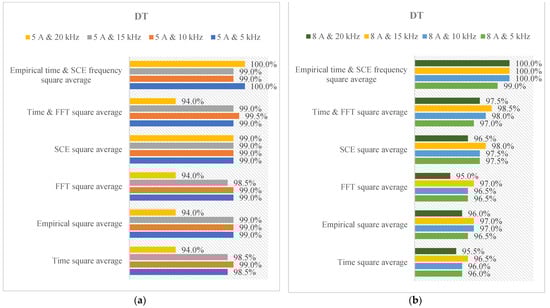 The diagnosis rates of DT under various current scales and switching rates. (a) 5 A load. (b) 8 A load.