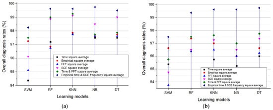 Figure 21 provides results of the accuracy of ILMs in the exciting field of DC arcing failure diagnosis using various features and different models. This observation emphasizes that the preprocessing techniques complement each other effectively, enhancing diagnostic accuracy. Additionally, it is worth noting that the accuracy achieved using the combination of time domain square average and frequency FFT square average closely align with the proposed scheme. This result suggests that traditional methods that do not require advanced preprocessing can still provide competitive accuracy, particularly in specific scenarios. This indicates that while advanced techniques, like empirical filtering and SCE, offer significant benefits, there is still value in more straightforward approaches. Within the domain of ILMs, RF and KNN consistently stand out as the top performers, irrespective of the input or switching rates. This incredible reliability emphasizes the strong abilities of ILMs for DC arcing failure diagnosis. Their adaptability and accuracy in providing diagnoses across diverse conditions render them highly suitable for arc fault detection systems. In summary, the diagnostic results are both evident and compelling. The proposed approach for DC arc fault diagnosis consistently surpasses various alternative techniques, underscoring its potential to enhance diagnosis accuracy across a spectrum of scenarios. The integration of empirical filtering and SCE, coupled with versatile learning models, such as RF and KNN, presents a formidable strategy for DC arc fault detection. This study constitutes a significant contribution to the realm of electrical system safety, addressing a critical concern in applications where DC arc faults pose substantial risks. The results confirm the viability of these approaches and lay the foundation for more reliable and accurate arc fault detection systems, ultimately enhancing safety and reducing the potential for catastrophic electrical events. The comprehensive diagnostic procedures applied to square averages were replicated for additional features, including average, median, p2p, RMS, and variance. Through extensive analysis, it is clear that the combination of the empirical filtering square average with the SCE square average consistently outperforms alternative configurations across diverse input scenarios. The intricate details of this comparison are omitted for brevity, focusing on the collective superiority of these combined square averages. In Figure 22, an exhaustive overview of the accuracy of ILMs is presented, utilizing various input features in the demanding area of DC arcing failure diagnosis. The performance evaluation indicates that the square average, median, and RMS features exhibit superior capabilities in diagnosing arc faults compared to p2p and variance features. These findings underscore the effectiveness of this diagnosis approach, consistently surpassing alternative techniques and demonstrating its potential to enhance diagnostic accuracy across a spectrum of scenarios. The results not only validate the viability of the employed approaches but also establish a robust foundation for the development of more reliable and accurate arc fault detection systems. This advancement holds significant promise for improving overall safety in electrical systems and mitigating the risks associated with potentially catastrophic electrical events. The thorough exploration and comparison of various features contribute valuable insights to the refinement and optimization of future diagnostic methodologies in the context of DC arc fault detection. The developed features in this paper showed better performance in comparison with previous approaches to detect the DC arc failures using some catalogue [19]. The previous approach in [19] used a few simple features, which were integral, kurtosis, and Shannon entropy, to detect the DC arc faults. On the other hand, this work proposed new features different than those used in the previous paper, which are the square average, the average, the median, the rms, the peak-to-peak, and the variance values, to find out which one can be the most effective features to detect DC arc failure. In this paper, the new features, such as the square average, the rms, and the median values among the various features, which can detect the DC arc failure more accurately than the simple features of the previous paper. Furthermore, this paper addressed which artificial learning model can be better in conjunction with the various developed features, and the K-nearest neighbor (KNN) was found out to show the best accuracy. In addition, the proposed setup includes an arc generator designed to produce well-defined arcs, as evidenced by the distinct patterns observed in Figure 2, which depict the differences between different states. These patterns serve as valuable indicators for identifying and characterizing fault events within the electrical system. However, the system’s performance in scenarios involving the superimposition of a normal state with a state of low-intensity arcing is noteworthy. In such cases, where low-intensity arcing may occur concurrently with normal operating conditions, the detection of arcing events becomes more challenging due to the presence of subtle variations in the electrical signals. To address this challenge, this proposed detection method leverages advanced signal processing techniques and feature extraction algorithms to discern subtle changes in the waveform characteristics associated with low-intensity arcing. By analyzing the temporal and spectral features of the electrical signals, this method is capable of detecting and distinguishing between different states, even in scenarios where the intensity of the arcing event is relatively low. Furthermore, the use of machine learning algorithms enhances the system’s ability to identify patterns indicative of arcing activity, allowing for the reliable detec