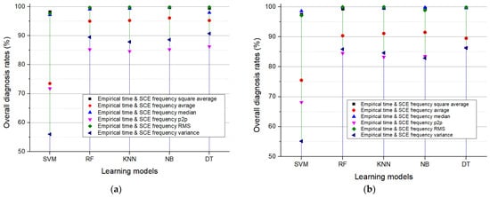 The diagnosis rates of RF under various current scales and switching rates. (a) 5 A load. (b) 8 A load.
