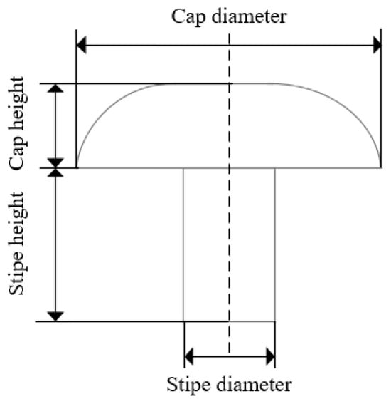 Cap diameter, cap height, stipe diameter, and stipe height measurement of mushrooms.