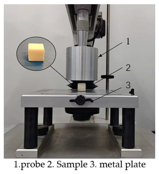 In order to determine the mechanical properties of the stipe, such as elastic modulus, Poisson’s ratio, and biological yield point, compression tests were required for the stipe samples. The tests were carried out using the SMS texture analyzer from the UK, as shown in Figure 3. Room temperature conditions (22 °C ± 1 °C, 40–60% RH). The mushroom stipe sample was placed between the texture analyzer probe and the metal plate. The probe applied compression to the samples at a rate of 1 mm/s along the downward direction (within the quasi-static range). Each test included 10 samples.