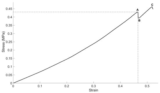 The stress–strain curve of stipe sample. A is the elastic limit, B is the yield point, C is the failure point.