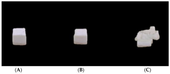 The stress–strain curve of the mushroom stipe is obtained by the compression test, as shown in Figure 4. Before point A, the sample is in the elastic stage, where the curve is approximately linear, and the elastic modulus is the tangent line of the elastic stage. Point B is the yield point, and the yield stress is the stress at this point. When the curve reaches point B, the sample begins plastic deformation, and this deformation causes irreversible damage to the stipe. Point C is the failure point, and when the curve reaches point C, the sample ruptures and the stress begins to decrease. The deformation of stipe samples at points A, B, C is shown in Figure 5.