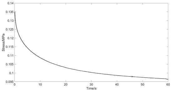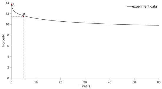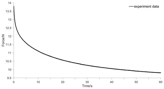 In order to quantitatively describe the stress relaxation characteristics of mushroom stipes, the relevant stress relaxation parameters of the stipes were obtained by stress relaxation tests to clarify the gripping dynamic decay law. For stress relaxation tests, an initial compressive stress needs to be applied. If the deformation of the stipe is too small, it cannot reflect the significant observed stress changes, while excessive deformation may lead to stipe damage []. According to the compression characteristics obtained in Section 2.2, we set the initial state of the relaxation test with a compression deformation of 2 mm (strain approximately 0.2, within the normal range of strain), and a pre-compression rate of 1 mm/s (within the quasi-static range). After the probe reached the initial state of compression, the displacement was kept unchanged for 60 s. The stress relaxation curve obtained dynamically by the texture analyzer is shown in Figure 6.