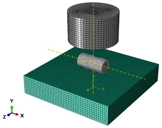 In agricultural fruit and vegetable simulation, hexahedral elements are usually used for meshing []. Hexahedral meshes have higher accuracy, fewer nodes, and lower computational cost than tetrahedral meshes, and are capable of handling plasticity, large deflections, and large strains. Moreover, they are also suitable for modeling irregular shapes and curved boundaries. Therefore, the mushroom stipes, the texture analyzer probe, and the metal plate were meshed with hexahedral cells. In contact stress analysis, the contact region is the most important. Compared with other regions, the contact region should have good mesh conformity. So, the meshing should create a denser mesh in the contact area between the mushroom stipe and the texture analyzer probe, as well as between the mushroom stipe and the metal plate. Additionally, it should be ensured that the integration points in the contact area can be corresponded. The meshing of the 3D model is shown in Figure 7.