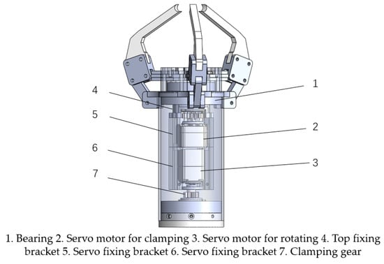 The rotating actuator mainly includes servo motor, clamping gear, servo fixing bracket, bottom fixing bracket, top fixing bracket, bearings, etc. The clamping gear remains stationary while the large gear meshes with it. The output shaft of the servo motor is connected to the big gear, driving it to rotate synchronously around the clamping gear. Meanwhile, to secure the servo motor, it is closely embedded with a servo fixing bracket. The servo fixing bracket is embedded in a bearing, and the bearing is embedded in the top fixing bracket. The top fixing bracket is connected to the outer shell of the picking grasper. When the servo motor rotates, it drives the entire grasper to rotate, accordingly.