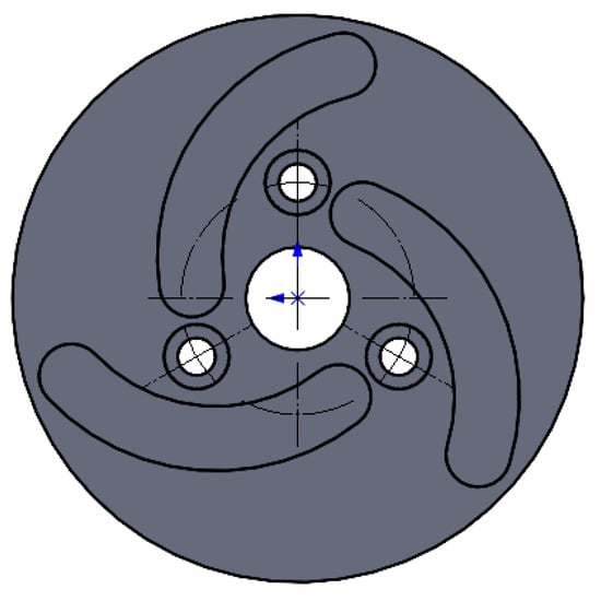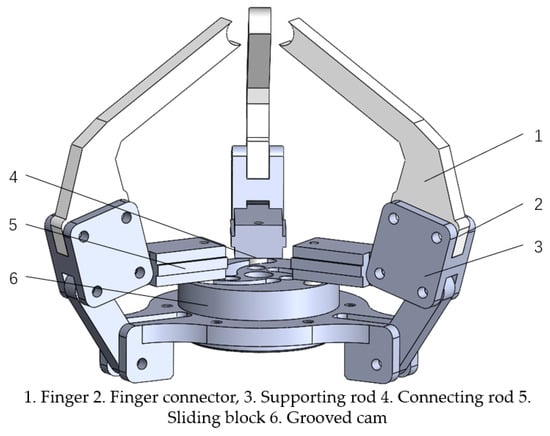 The gripping actuator mainly includes finger, finger connector, supporting rod, sliding block, connecting rod, grooved cam, etc., as shown in Figure 11. In order to prevent damage to the mushroom cap during gripping, the finger is designed as an “L”-shaped structure, and made of TPU 95A material. The maximum distance between the fingers is 80 mm, which can effectively avoid contact with the cap. Each finger is equipped with a 1 mm thick silicone pad on the surface to increase friction between the finger and the fruit, ensuring stable gripping and preventing the stipe from slipping []. Three “L”-shaped fingers are evenly distributed at the base of the picking grasper, and their motion is roughly the same. The grooved cam adopts a centering structure, and is symmetrically distributed about the center of the mechanism; the whole is a triangular symmetrical structure, as shown in Figure 12. The connecting rod is connected to the sliding block, and by controlling the rotation angle and direction of the servo motor, it can move within the cam groove according to a predetermined pattern. This mechanism converts the rotational motion of the servo motor into translational motion of the sliding block, causing the picking grasper to contract inward.