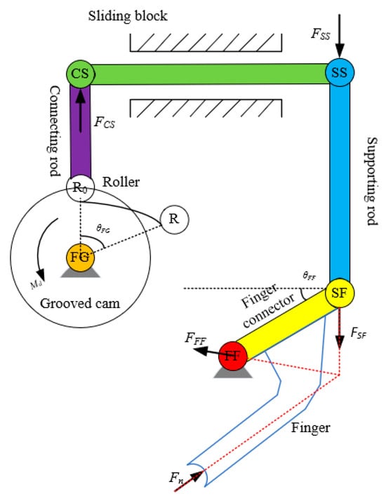 The structure and motion principle of the grasper’s gripping actuator are shown in Figure 13. The finger can be equated to a single concentrated force in the force analysis (the force and torque analysis on the finger structure is discussed below). During grasping, the servo motor drives the grooved cam to rotate clockwise, and the cam pulls the sliding block to move and drives the supporting rod to move. Subsequently, the finger connector is driven by the support rod to rotate around the joint FF to realize the gripping motion of the finger.