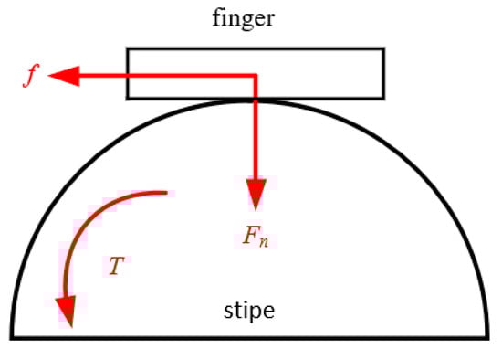 From Equations (16) and (20), the relationship between the grasper’s gripping force Fn, twisting separation torque T of the fingers on the mushroom stipe, and the servo output torque Md is established. Therefore, when the twisting separation torque required for actual picking is determined, the corresponding servo output torque Md can be obtained. At the same time, the gripping force Fn acting on the surface of the stipe can be determined. Considering the stress relaxation characteristics of the stipe during twisting, it should be circumvented to avoid that the clamping force Fn is greater than the maximum pressure that the stipe can withstand when twisting has just begun.