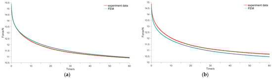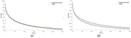 In order to validate the results of the finite element analysis of mushroom stipe stress relaxation discussed in Section 2.4, validation tests were conducted on the entire mushroom stipes. Four groups of stipes with diameters of 10, 12, 14, and 16 mm were used for the validation experiments, with each group comprising 10 stipes and a total of 40 samples. Due to the probe diameter of 50 mm, which is significantly larger than the stipe diameter, it is difficult to quantify accurately the contact area between the probe and the stipe. Therefore, it was difficult to calculate accurately the stress applied to the mushroom stipe when the validation tests were conducted on the whole stipe. As a result, we chose the parameter of pressure applied to the stipe to validate the results of the finite element analysis. The compression validation test was carried out on the sample with a compression deformation of 2 mm, compression rate of 1 mm/s, and the displacement was kept constant for 60 s. The pressure curve of the mushroom stipe was dynamically obtained by the texture analyzer, and the results were compared with those of the finite element analysis presented in Section 2.4. The results of the four groups of validation comparative tests are shown in Figure 16. The finite element analysis results exhibits a high degree of agreement with the experimental results, with a mean square error of less than 5%.