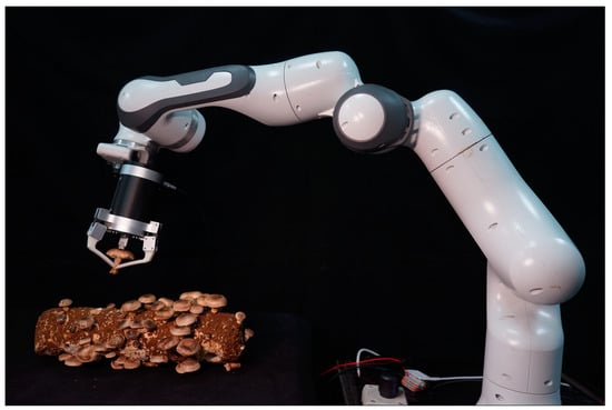 The shiitake mushroom is one of the edible fungi with the largest cultivation scale and cultivation range in the world due to its good edible and medicinal values []. China’s shiitake mushroom production ranks first in the world, accounting for over 90% of the global production, which reached 12.554 million tons in 2021 []. Shiitake mushrooms cultivated in sticks require selective and timely harvesting at high frequency to ensure their perfect edible quality. Currently, relying on manual picking consumes a large amount of labor and becomes an important factor in increasing production costs []. Consequently, there is growing interest in China’s development of autonomous harvesting robots to replace manual labor.