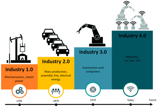 There is agreement on the term Industry 4.0, mainly in the distinction between the previous development stages: Industry 1.0, which is characterized by the use of complex mechanics and the introduction of steam engines in production processes; Industry 2.0, which is characterized by the use of assembly lines, the use of electrical systems, and mass production in general; Industry 3.0, where computers and a highly automated system were introduced into production; and Industry 4.0, which is characterized by the networking of previously automated processes and the utilization and processing of large amounts of data using new concepts and technologies [21,22]; see Figure 2.