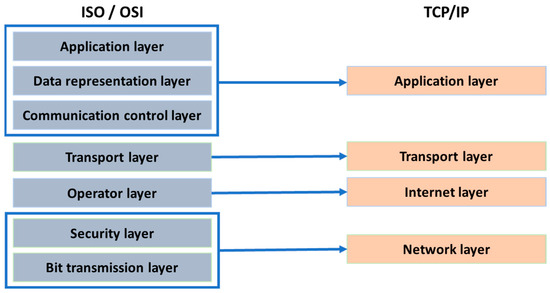 As development progressed, further options for machine communication with IT systems were developed. Some of these were further developments of existing technologies and protocols from the previous automation phase, as well as new developments [38]. The types of communication that became established in the field of machine communication were the possibility of communication via Transmission Control Protocol (TCP)/Internet Protocol (IP) and User Datagram Protocol (UDP). Machine communication via TCP/IP involves several protocols for data transmission from machine to IT system [38]. The modelling is based on the International Standards Organization (ISO)/Open Systems Interconnection (OSI) reference model, whereby the TCP/IP model represents a condensation; see Figure 5 [51].