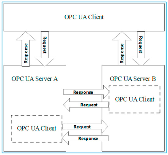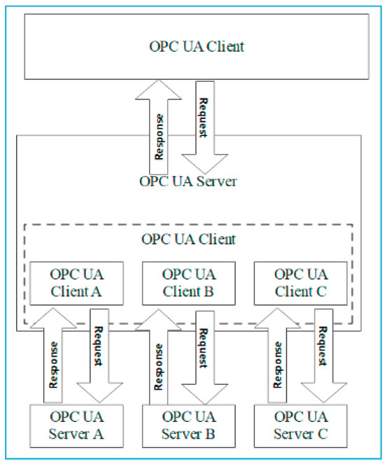 When communicating data from machines to IT systems, OPC UA uses either a client-server architecture [64] or the so-called publish–subscribe method [73]. In the much more widespread client-server architecture, the machine is usually the server, while the IT system is the client [74]. The server in the machine allows queries and conditions to be generated directly from the raw data of the machine and thus forms an initial filter. The client’s implementation in the area of IT systems has the advantage that different software agents can access the server’s data independently. However, it is also possible that both server and client are implemented in IT systems, whereby in this case, the central (aggregation) server serves as a middleware for forwarding data; see Figure 6 [75].