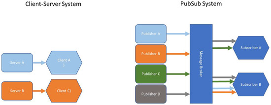 With the PubSub method, data can be provided by different machines or senders (publishers) and retrieved by one or more data processors (subscribers) via a message broker, depending on the network architecture, in contrast to the client–server system [73,77,78]. See Figure 8.